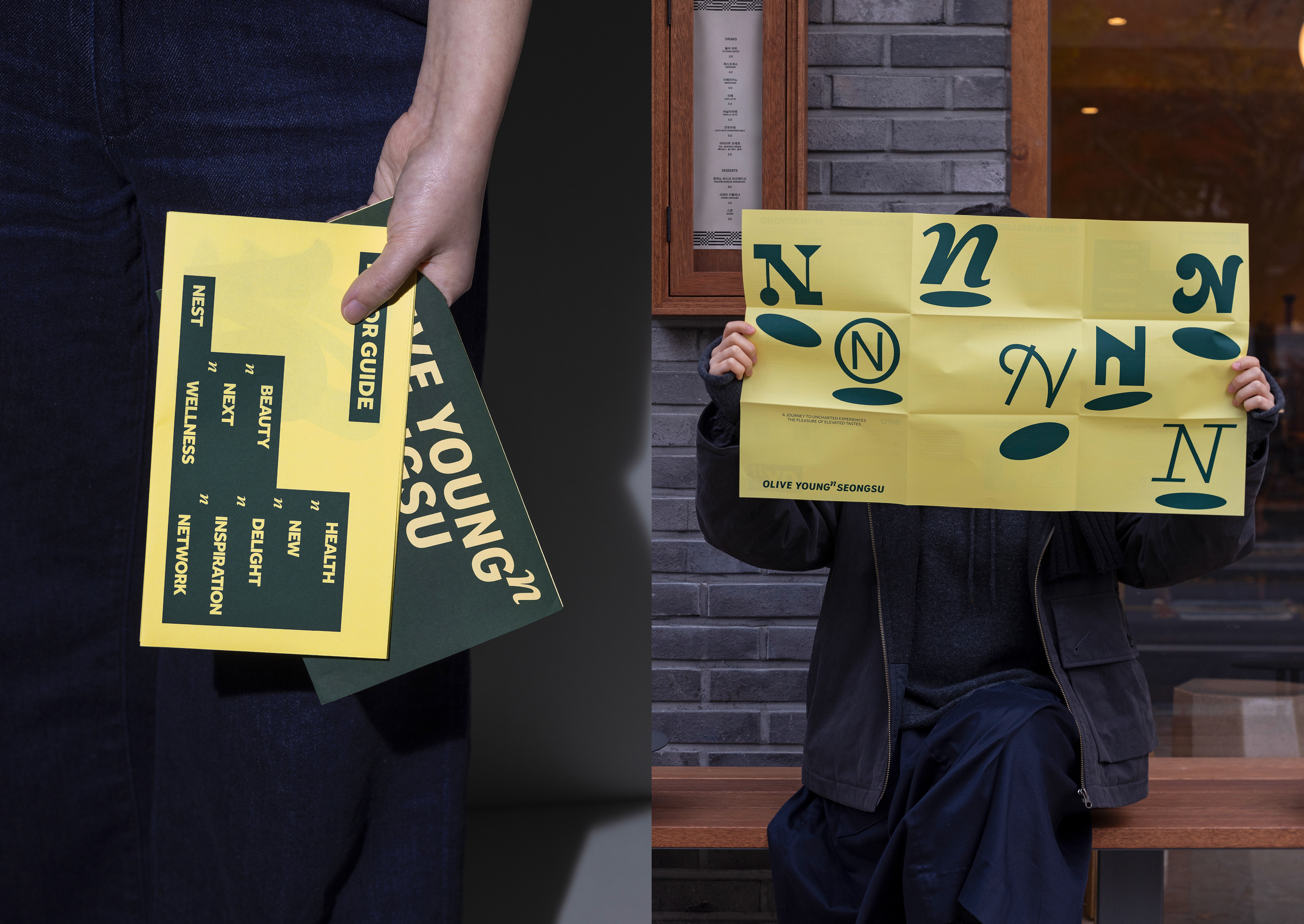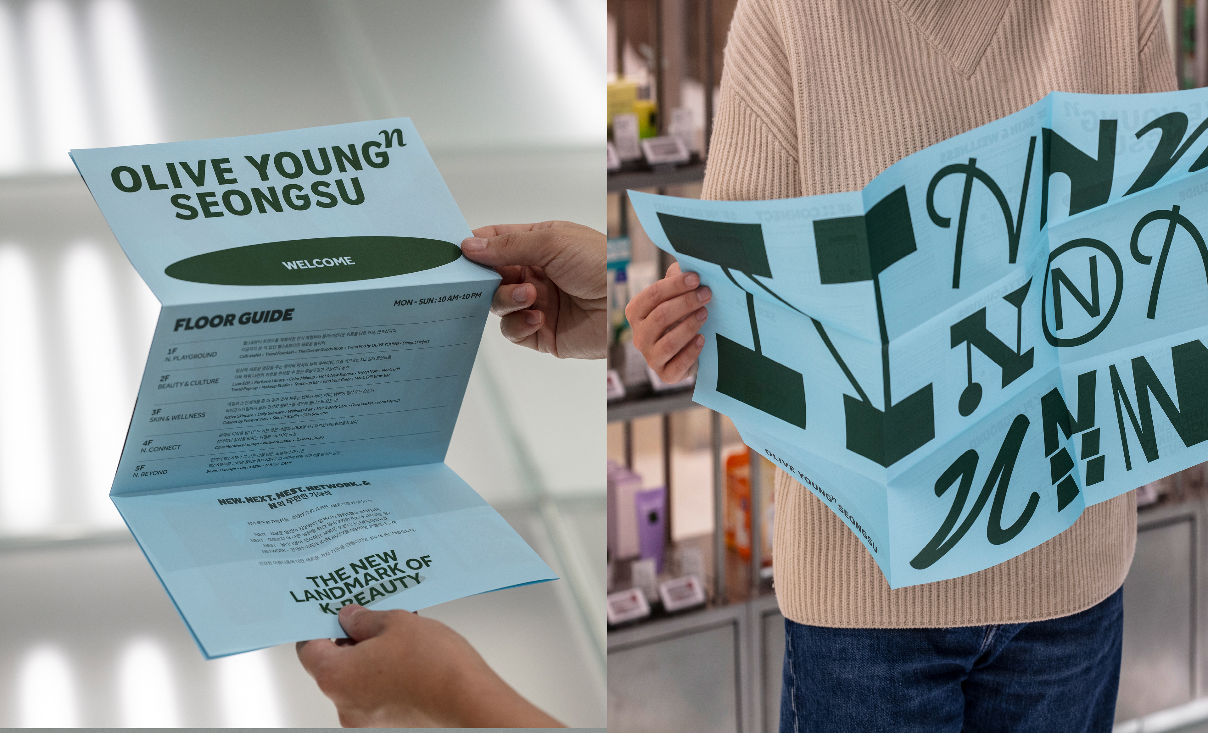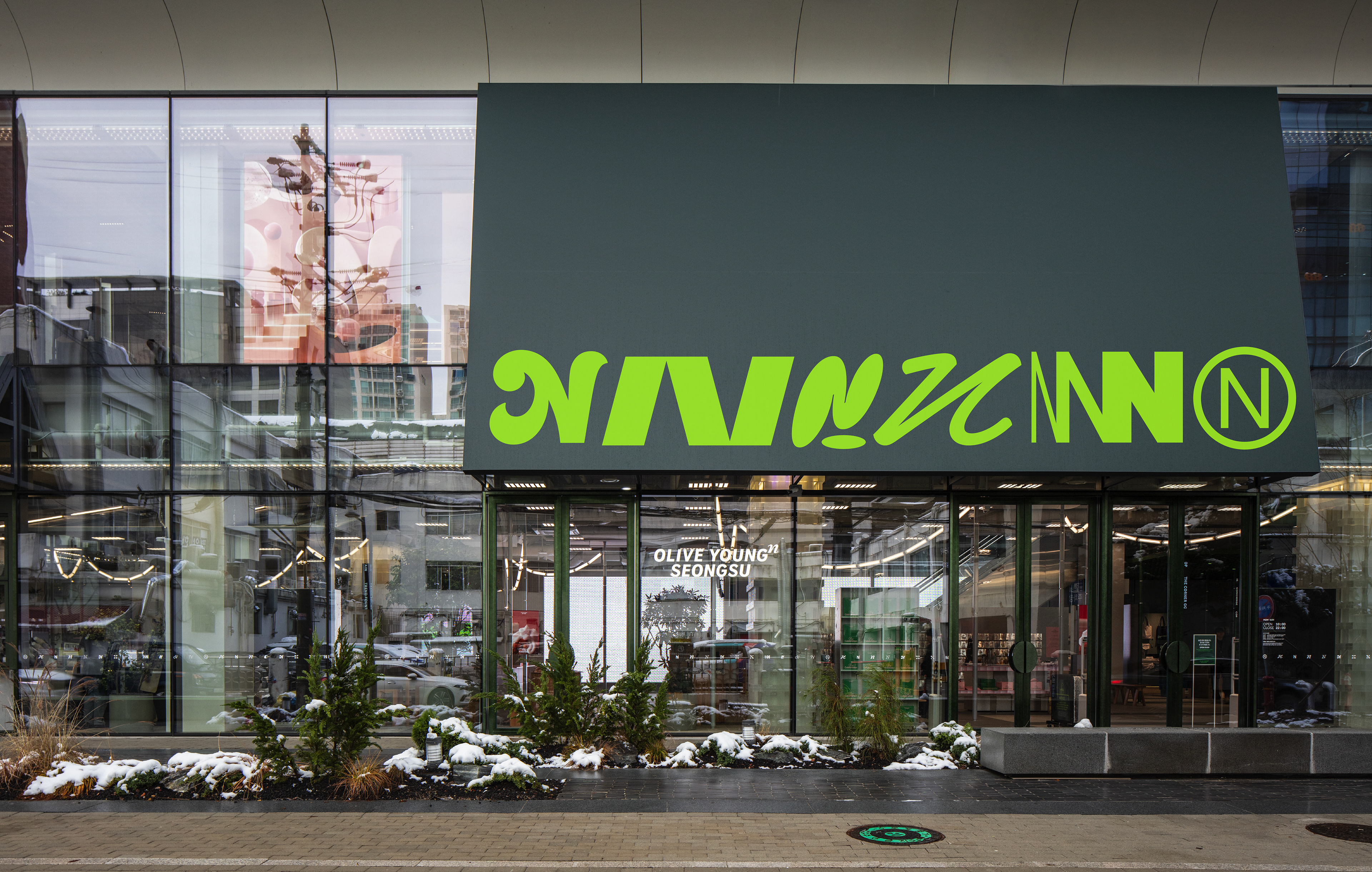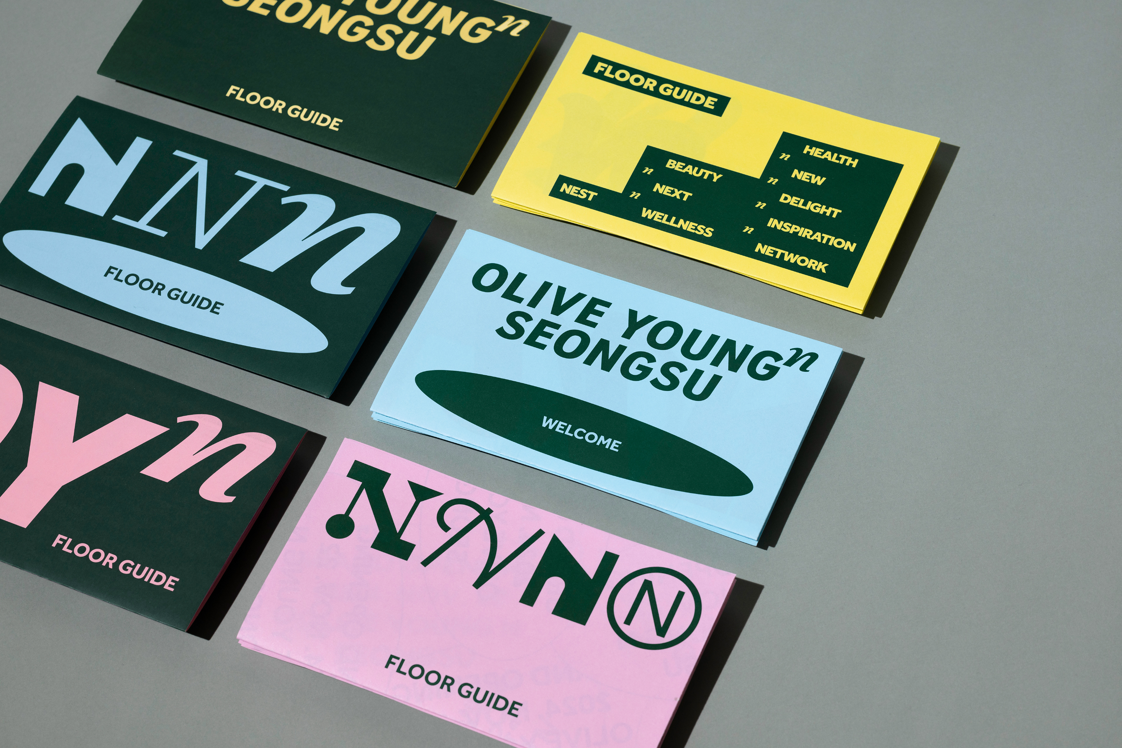 Olive Young N Seongsu is an experiential space that goes beyond health and beauty, offering a new dimension of lifestyle inspiration and the joy of discovery. CFC developed the BI by interpreting the concept of N—representing New, Next, Nest, Network, and &—as an exponential idea, expressing Olive Young’s limitless potential. This concept was expanded into a dynamic graphic system built around versatile variations of the “N.”